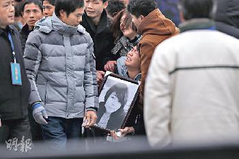 國務院副總理馬凱昨下午召開的全國安全生產電視電話會議上指出.除夕夜上海市外灘發生的群眾聚集踩踏事件,社會影響極其惡劣。國家旅遊局副局長杜一力更在官網發文指出,儘管外灘跨年未有組織活動,但公共事件的責任主體已明確為各級政府,“沒有組織的活動,當地政府仍然要對安全負責”。圖為家屬手捧死者的遺照到場拜祭時激動痛哭,需要其他親屬安慰,一名“志願者”(左一)則在旁看守。(香港明報)