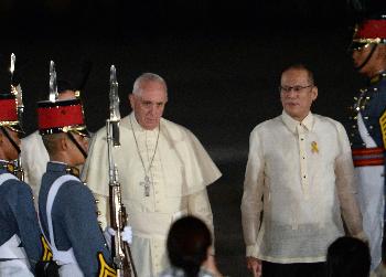 教宗方濟各在當地時間週四下午5時30分,由斯里蘭卡飛抵馬尼拉,菲國總統小阿奎諾(右)率領12名內閣官員,與當地天主教高層神職人員一同接機,現場響起21響禮炮。教宗其後乘車前往下榻地點,沿途數以萬計民眾夾道歡迎。菲國政府特別將教宗訪問期間定為全國公眾假期。(圖:法新社)