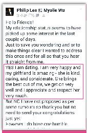Philip昨日在臉書撰文,並附上與杏兒的親密合照,兩人望著鏡頭笑得開心甜蜜。Philip表示知道大家對他的感情生活很有興趣,他就在此說一次。他直言兩人在約會,很開心。他指杏兒是好出色、好正的女朋友,很有愛心,好照顧人又體貼,他們相處得很好,他好欣賞和尊重她。他又澄清已求婚傳聞,表示未求婚,大家不用再恭喜他。他請求大家尊重及支持他們,不要在他的臉書那照片。他最後說生命是美好,他會繼續做大家認識的他。