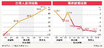 “兩岸統獨指數”在1995年達到10.1%的最高點,當時的台灣總統是李登輝,其後便一路下滑到1999年的負0.9%。2000年陳水扁總統上台後,該指數迅速攀升,2001年升高到7.9%,隨後持續下跌到2004年的低點負7.5%,2007年為陳水扁政府時期的最低點負9.6%。馬英九2008年上台後,“兩岸統獨指數”立刻跌到負12.9%的歷史最低點,2014年更成為歷年來“兩岸統獨指數”最低的時期。