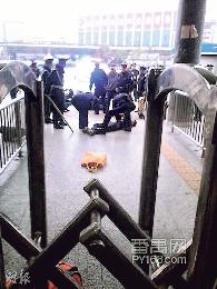 廣州火車站昨日發生斬人事件,兩名男子持刀斬傷9人,其中一名兇徒當場被擊斃,另一疑兇被捕。現場遍地行李和傷者,一片狼藉,圖為公安武警正救助傷者。(網上圖片)