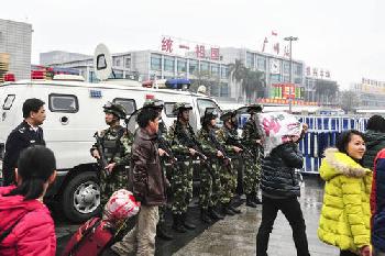 事件發生後,火車站廣場東側被封閉,持鎗武警在現場戒備。(圖:中國中新社)