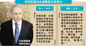 (以色列)以色列總理內塔尼亞胡週四接受美國電視台訪問時,表示在有條件下並不反對建立巴勒斯坦國,幾乎完全推翻他在大選形勢落後下矢言“在其總理任內絕不容巴人立國”的說法;此一“轉軚”之舉被解讀為向美國示好。美國總統奧巴馬週四終於致電祝賀他勝選,重申美國主張以巴兩國並存方案,同時表示因內塔尼亞胡的強硬言論,美國將重新評估對中東政策選項。