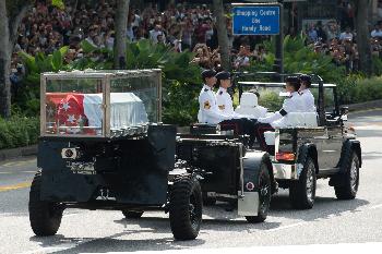 (新加坡)新加坡建國總理李光耀今日國葬,官方以最高規格送別這名星洲之父,舉國同哀,包括中港台的數十個國家地區代表出席。李光耀靈柩午後由炮架靈車緩緩拖行,走完人世最後15公里路程,回首其奮鬥一生打造的閃耀之城,亦讓其一生記掛的星洲人民夾道相送。移靈隊伍途經多個地標,可說代表了其人生和政壇足迹。日暮獅城,5時15分國葬禮畢,靈柩隨即送往火化,一代巨人化為輕煙。