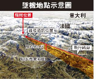法國當局稱,在墜機的山區找尋遺體和客機殘骸,是一件非常危險的事,他們須要面對強風及險要的地勢。搜救人員爬上崎嶇的山上,要用指甲緊抓住峭壁,當局派了45名有高山地區經驗的警員,協助法醫小組安全搜索遺體。法國醫療部門人員已向遇難者家屬抽取血液樣本,以比對DNA。