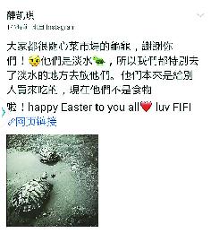 (香港)薛凱琪(Fiona)又因愛護動物“出事”,她昨日在微博上載有兩隻烏龜游進水裡的照片,她並留言:“復活節放生生!”然後再說:“放牠的時候,牠回頭看我們好幾次,好像跟我們說謝謝一樣!牠們自由了!”但這可能只是薛凱琪一廂情願的想法,她的“放生”行為,惹起不少網民不滿,認為她“將淡水龜放落鹹水海,反而令烏龜生命面臨威脅”,更鬧爆她無知,指“巴西龜是淡水龜來,放海等於間接殺了牠”。亦有網民指“巴西龜是生態殺手,會破壞生態平衡,主要食物是蛇蛙的卵和小魚苗,你放了牠是害無數眾生。修行人不養不殺,做好自己,就好了!”不過,亦有網民幫口:“出發點是好的,諸惡莫作,諸善奉行”,以及留言:“有愛心,但未必做了件好事,理性的粉絲給大家上了一堂生物課,罵來罵去的人,也就保持點素質吧!”