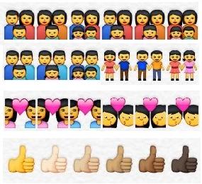 iPhone及iPad用戶週三起可使用新Emoji,包括由男男父母組成的家庭、女女父母組成的家庭、男同性戀者和女同性戀者等。除性向變得多樣化外,人物公仔亦有多種膚色供選擇,包括黑、啡、黃等。新版又新增32款國旗或區旗,當中包括香港及澳門。