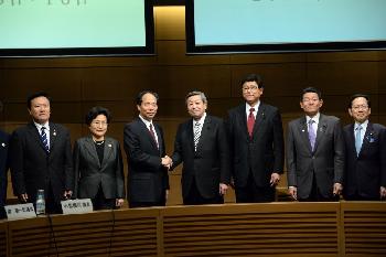 日方參會代表團團長林幹雄(左三)昨日在日本國會眾議院與全國人大常委會副委員長吉炳軒(左二)握手。(圖:新華社)