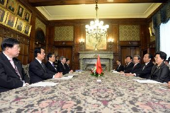 日本國會眾議院議長町村信孝(左三)會見中國全國人大常委會副委員長吉炳軒(右二)。(圖:新華社)