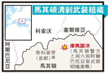(馬其頓)馬其頓警方在北部阿爾巴尼亞裔聚居城鎮庫馬諾沃清剿一個由科索沃阿爾巴尼亞裔激進份子領導的武裝組織,雙方激戰一整天,導致最少22人死,包括8名警員。事件引起外界憂慮這個巴爾幹半島國家再度爆發族裔暴力衝突,北約和歐盟呼吁各方克制。