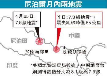 (尼泊爾)尼泊爾昨中午發生黎克特制7.3級強烈地震,為當地3星期內兩度受災,昨日造成最少37人死亡,逾千人受傷。中國及印度亦受波及,多人死傷。專家相信,昨日地震為上月地震後的連鎖反應。