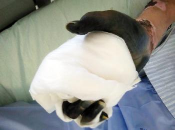 鍾雪梅說:“他的血壓在凌晨時分跌到很低,醫生做出判斷需要給他用藥控制血壓保命,不過副作用是,他可能保不住手腳。"2天之後,他的血壓開始回升,醫生停止用藥,不過,他的手指已經開始發黑、起水泡、脫皮,漸漸坏死,猶如干屍。