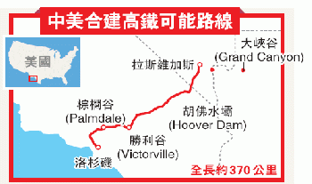 據通氣會上透露,這條高鐵將在明年9月開工,從內華達州拉斯維加斯到加州勝利谷(Victorville)和棕櫚谷(Palmdale),最終到洛杉磯(見圖),全長370公里。中國鐵路國際公司董事長楊忠民表示,此項目是中國在美國首個系統性合作的高鐵項目,亦是中美經貿合作的重大基建項目之一,對中國鐵路“走出去”具有特殊意義。舒國增亦稱,高鐵項目會為當地帶來新的就業,包括技術類、製造業和建造業。