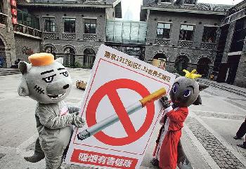 世衛報告指中國每年100多萬人死於煙草相關疾病。圖為灰太狼在南京抬着禁煙宣傳板宣傳禁煙。(圖:中新社)