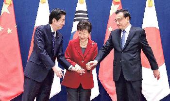 (中國)第6次中日韓領導人峰會在時隔3年半之後,昨於韓國首爾舉行;國務院總理李克強、日本首相安倍晉三和韓國總統朴槿惠會後發表《東北亞和平與合作聯合宣言》,並一同見記者。李克強指“和平是人間正道”,三方同意“正視歷史”處理敏感問題,及明年在日本舉辦峰會。而在會後李克強又與安倍單獨會談,同意恢復高層經濟對話和外長互訪。