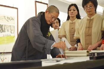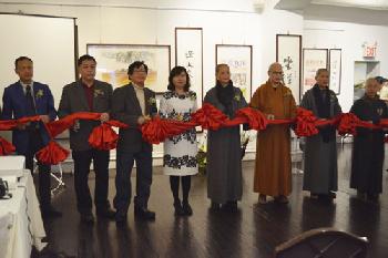 (紐約.本報記者報導)法拉盛文藝中心(Flushing Town Hall)2日舉辦以「自然之禪」為主題的「拾得書畫陶瓷禪意展」剪綵儀式。來自台灣的拾得法師,除為民眾講解其自身的創作歷程外,並當場揮毫寫下「禪心」、「無聲之音」、「色即是空即色」等書法,贈予現場觀眾。