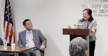 (紐約·留天佑6日報導)生於台灣、現年52歲的本地法律界人士郭佩琪(Peggy Kuo,圖右),獲任命為聯邦助理法官,昨日在紐約東區聯邦法院羅斯福法庭宣誓就職。