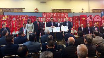 (紐約.留天佑18日報導)紐約開平同鄉會昨日舉行2016至2017年度職員就職典禮。儀式由駐紐約台北經濟文化辦事處副處長陳豐裕主持。主席馮天仕、鄧學源、司徒傑、總顧問張堅,在逾百僑團首長見證下就任,場面莊嚴隆重。