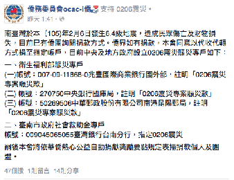 (三)帳號:50269506中華郵政股份有限公司南港昆陽郵局,註明「0206震災專案賑災款」