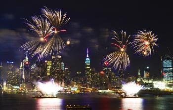 「歡樂春節‧藝術中國匯」系列活動6日晚間在曼哈頓帝國大廈及為哈德遜河上空同時舉行慶祝春節的煙花及燈光秀相互輝映十分燦爛。(圖:中國中央美術學院提供)