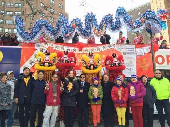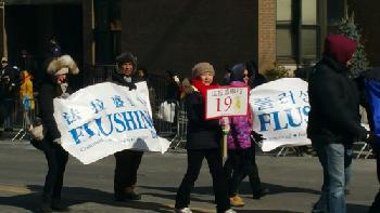 而法拉盛的新春遊行,則在友聯街109分局前,在市警察鼓樂團開道下,起步遊行。華人社團參加遊行的隊伍在金龍騰飛起舞,醒獅在鑼鼓鬧聲中拜年,突顯了華、韓兩大民族,過新年的熱鬧與歡樂。