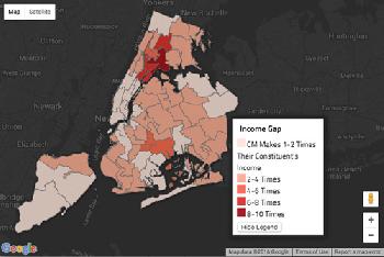 (紐約.留天佑17日報導)市議會月初以40票支持、7票反對,通過了給議員及民選官員加薪32%的法案,條件是不賺任何外快,議長和各委員會主席的津貼也會取消。據主流媒體統計,加薪案進一步拉大了官員與其選民收入的差距(圖),以市議長馬麗桃為例,其年薪是所屬選區中位收入的8倍。