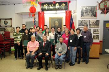 中華公所伍銳賢主席為了表揚他們,上週六向報稅義工頒發感謝狀,以表謝意。前排左起為:公所中文秘書陳炎銘,伍銳賢,和英文秘書呂麟。