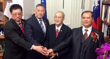 蕭貴源由伍銳賢引領下進入主席辦公室,左為台山寧陽會館主席黃士初,右為美東聯成公所主席鄧學源。(圖:留天佑攝)