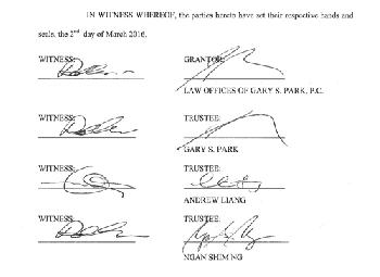 文件顯示,「梁彼得法律基金」有三位信託人:律師Gary S. Park、梁彼得的胞弟Andrew Liang,和社區人士伍雁蟬。(圖:梁彼得代表律師提供)