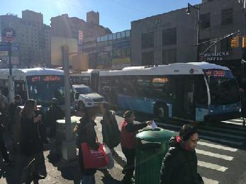 皇后區Q44特許快巴自三個月前實施後,Q44巴士獨佔一個車道讓駕駛人無所適從,在只有兩個車道的馬路上,類似這種私家車輛被兩輛巴士夾殺的鏡頭屢見不鮮。(圖:讀者提供)