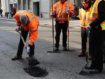 昨日上午,市長白思豪,聯同交通局局長波利(Polly Trottenberg)等多名官員,一起親手修補,位於曼哈頓東村東13街的第1萬個坑洞(圖)。
