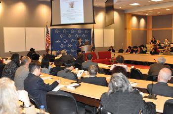 張美芳出席紐約州立大學商務孔子學院活動(圖)時,圍繞「十三五」規劃及中美關係發表演講,並回答了現場主持人及觀眾提出的問題。來自紐約地區政商界、智庫學者、高校師生等逾百人出席。