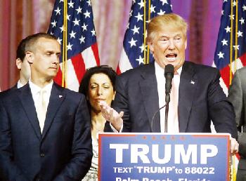 (明報30日訊)美國共和黨總統參選人川普(圖左)的競選經理里萬德斯基(圖右)被指稱在8日的造勢活動中將一名記者的手臂抓到瘀青,週二在佛羅里達州被控毆打。
