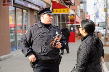 (紐約.留天佑12日報導)紐約市府提出「零死亡願景」(Vision Zero)交通安全方針踏進第3年,交通局聯同市警在各區進行宣導,昨日局方前往華人聚居地布碌崙賓臣墟(圖),向行人及駕駛者灌輸正確道路安全訊息。