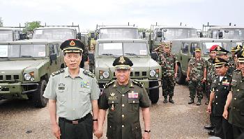 (柬埔寨)展示在金邊軍用機場的中國257輛軍車,於週三(6月23日)下午1時30分在毛毛細雨下,由中國人民解放軍總裝政治委員遲萬春移交給柬埔寨王家軍,由國防部國務秘書孟森潘代表接收。