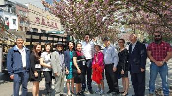 (紐約.羊展恬23日報導)22日為世界地球日,位於華埠孔子大廈周圍栽培的百餘棵櫻花樹大部份都已盛開,呈現一片繁花似錦的景象。為慶祝地球日並倡導環保與提升居民生活品質,在紐約州參議史葛靜的協助下,華埠孔子大廈昨日獲得市公園局贈送的11棵櫻花樹,將種植在包厘街的安全島上,也為孔子大廈今日舉行的年度「孔廈櫻花節」活動再錦上添花。