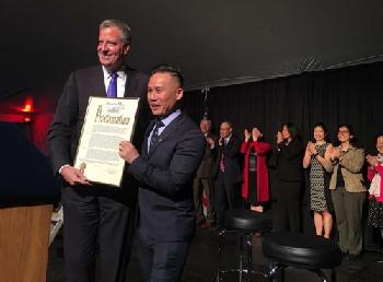 (紐約.留天佑13日報導)為慶祝每年5月份的「亞裔傳統月」,市長白思豪在官邸瑰西園舉辦酒會,來自紐約各界逾300名亞裔人士應邀出席。多年來為同性戀權益發聲的百老匯華裔演員黃榮亮(B.D.Wong)為當晚榮譽嘉賓,白思豪向他頒贈表揚狀(圖)。