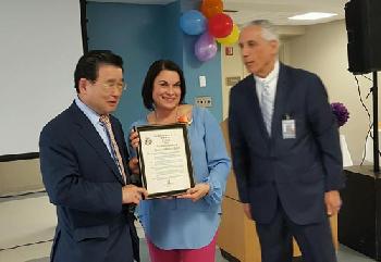 (紐約.羊展恬13日報導)法拉盛醫院昨日舉行「全國護士週」慶祝會,來自該院各族裔護士都出席活動共慶節日。市議員顧雅明應邀出席並頒發表揚狀給法拉盛醫院,肯定該院為社區居民提供的醫療服務與貢獻,由法拉盛醫院執行長Robert Levine及護士長Maria DeMarinis Smilios代表接受。