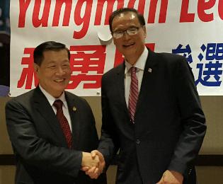 國際知名國際刑事鑑定專家李昌鈺(左)昨日風塵僕僕的自康州駕車到法拉盛力挺利勇民(右)參選國會眾議員。(圖:羊展恬攝)