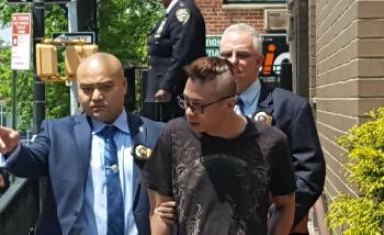 25歲華裔男子主嫌(中)昨日被法拉盛109分局逮捕後,於下午送押法庭過堂。(圖:本報記者攝)