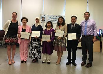 (紐約27日訊)為慶祝5月亞太裔傳統月,州眾議員李羅莎(Nily Rozic)(左一)昨日與州眾議員伯朗斯汀(右一)等多位州市議員共同在皇后區新鮮草原圖書館舉行慶祝會,並頒獎表揚包括華人家長會朱寶玲(左二)在內的5位對亞裔社區有貢獻人士。
