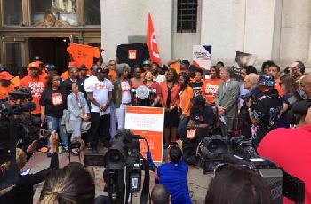 市議長馬麗桃聯同公共房屋委員會主席威廉斯、老人事務委員會主席陳倩雯,以及市公益維護人詹樂霞等(圖),共同宣佈紐約市政府對於控槍的決心。市長辦公室刑事司法及反暴力計劃主任Eric Cumberbatch也到場,以示行政、立法單位對此一議題上站在同一戰線。