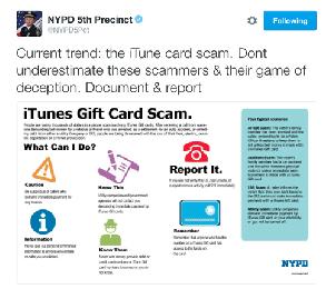 (紐約.留天佑8日報導)紐約華埠市警5分局通報,近期本地出現一種涉及蘋果iTunes儲值卡的詐騙案(圖),騙徒通常自稱是受害人的親友,因被捕或發生意外,要求受害人購買儲值卡代付款項。警方稱,iTunes儲值卡已成為匯款以外,許多騙子常用的詐騙交付方式,因為儲值卡過戶快速、便捷,且難以追查,即使受害人意識到被騙,被拿走的錢也要不回來。