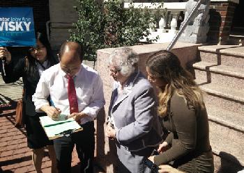 (紐約.留天佑11日報導)競逐連任的紐約州參議員史塔文斯基昨日在法拉盛地區拜訪選民,收集連署簽名。
