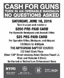 (紐約.留天佑16日報導)為減少槍械失竊導致的暴力事件,市警今年再度與曼哈頓多個機構合作舉行「槍枝回購」(Gun Buy Back)活動,呼籲市民本週六(18日)上繳家中武器,回購價格由25元至200元不等。
