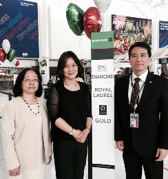 為慶祝長榮航空紐約-台北早班機首航,長榮航空7日在紐約甘迺迪機場舉行慶祝活動,紐約明報行政總裁劉正廷(中)也特地出席表示道賀,受到長榮航空紐約分公司總主任張宇堂(右)及客運課助理副課長林靜娟(左)等人的熱烈歡迎。(圖:羊展恬攝)