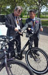 由台美企業技術合作生產的2輛電動腳踏車昨日也展示在電站的會場,由於這輛電動腳踏車輕巧且容易操作,成為昨日最受參觀者試騎的產品。(圖:羊展恬攝)