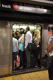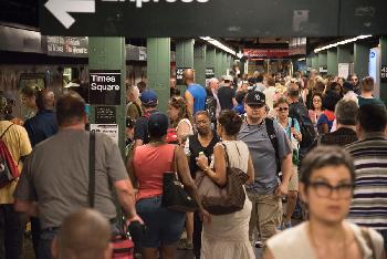 在曼哈頓中城42街-時報廣場站(圖),電力公司與員警忙著指揮交通及搶修電力系統。有華裔乘客表示,被困在列車上超過半小時,沒有空調,特別難受。