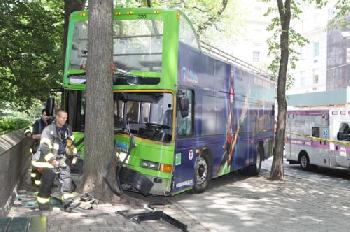(明報22日訊)據警方表示,一輛雙層觀光巴士21日下午1時左右,在曼哈頓五大道及東63街交口處,因閃避一輛突然變道的計程車,撞上中央公園附近的一棵大樹(圖),造成車上13名乘客受傷,目前傷者都已送往當地的醫院救治,情況穩定,且傷者的傷勢不至於會致命。