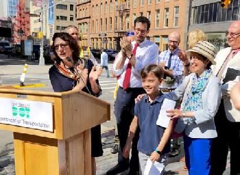 交通局局長查登伯格(Polly Trottenberg)昨日聯同華埠州參議員史葛靜、市議員陳倩雯,一起見證蘇豪區拉菲逸街夾加勉街(Kenmare St.),新的安全標識落成(圖)。該處是來往曼哈頓下城,以及荷蘭隧道的主要路段。